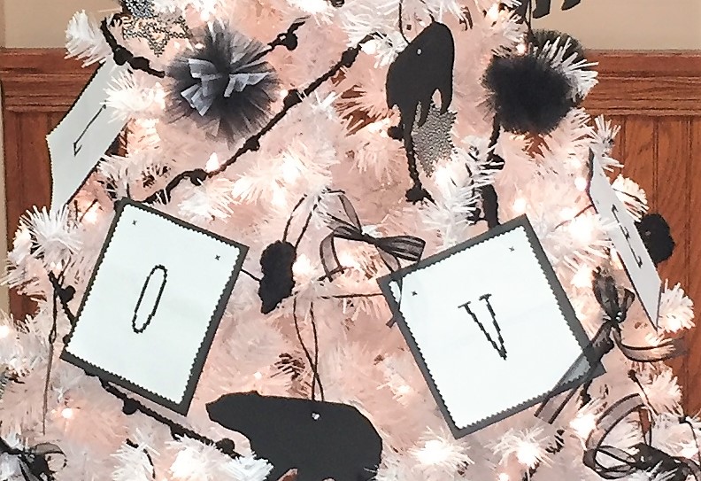 5" square of black scrapbook paper using two cross stitches. I uses black twine for the banner and attached it on the back of each mounted letter using those same top cross stitches. I think next year I will create the word believe again for my mantle.